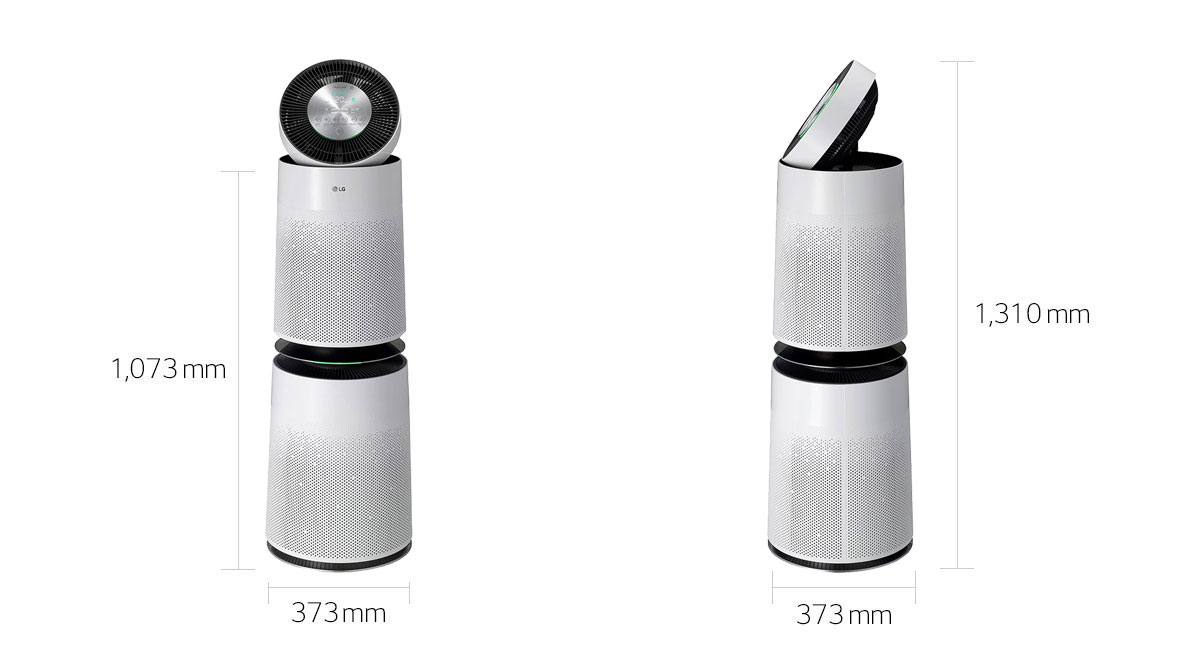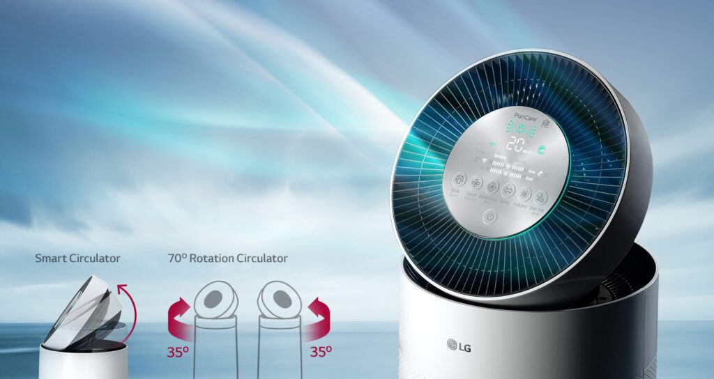 Penulen Udara LG PuriCare ™ menggunakan teknologi “Clean Booster” di mana ia boleh naik dan berputar untuk menyampaikan udara bersih ke semua penjuru.
