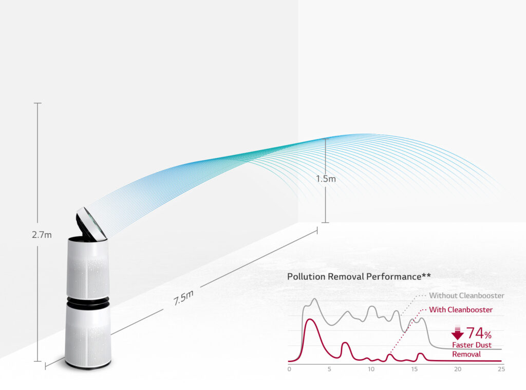 Penulen Udara LG PuriCare ™ menggunakan teknologi “Clean Booster” di mana ia boleh menghantar udara bersih sejauh 7.5m*